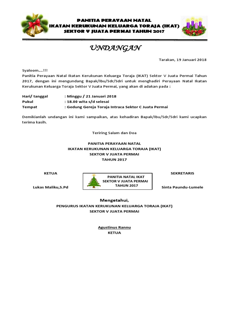 Shalom… untuk basudara yang di rantau… terkirim undangan natal untuk smua yang di rantau. Contoh undangan natal untuk pendeta batam, 08 desember 2010 kepada yth: Download & view contoh undangan natal as pdf for free. 82% 82% menganggap dokumen ini bermanfaat, tandai dokumen ini sebagai bermanfaat. Kali ini saya akan bagikan contoh kartu undangan yang biasa gereja saya lakukan untuk mengundang gereja sekitar.